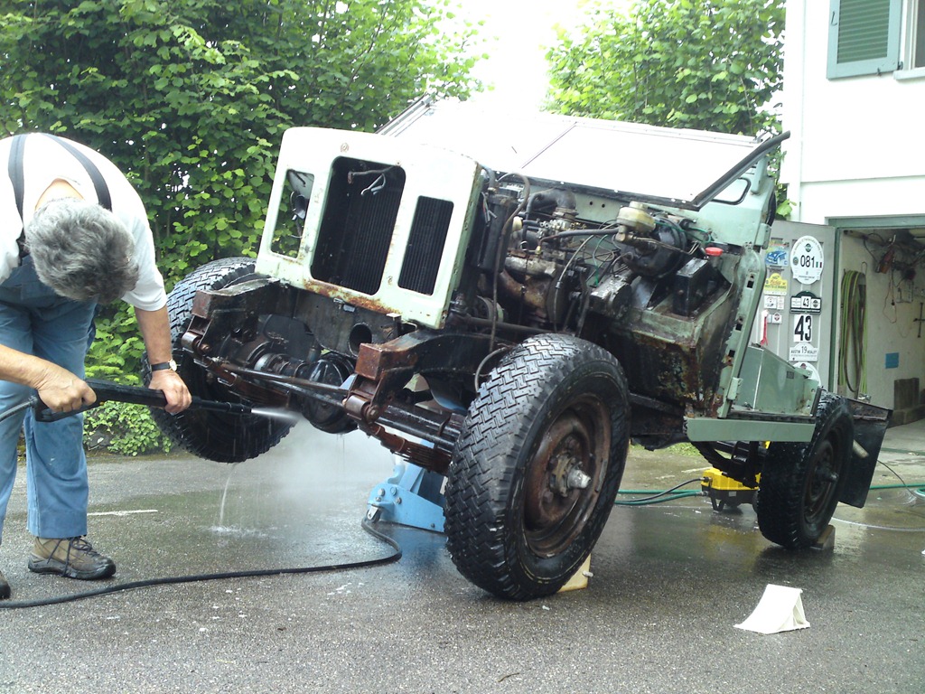 DSC01964Nachdem der Esel regelmässig alle mit Dreck beworfen hat, die sich einen Blick auf seine Unterseite erlaubt haben, ist heute mal Zeit für eine gründliche Hochdruckreinigung. Das weitgehend frei zugängliche Chassis zu duschen ist ein Vergnügen und entblösst grosse Mengen von üppigem Rostfrass. In dem Dreckklumpen vor der Spritzwand findet sich ausserdem tatsächlich ein Motor. Nach der Dusche einmal den Zündverteiler ausgeblasen und der Motor springt schön an. Braves Auto, gut für heute.