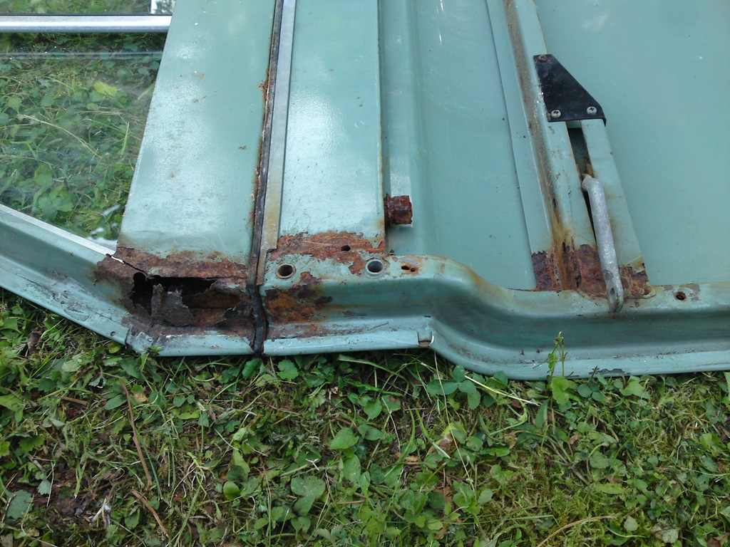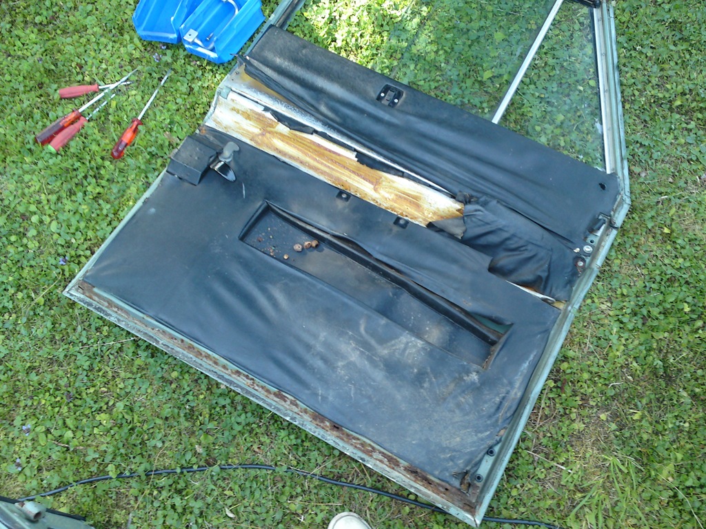 Die verrotteten Türunter- und Vorderkanten werden vorläufig nicht tiefgreifend repariert sondern nur gesäubert und kunststofftechnisch verschlossen, da die Patina auf der Türhaut erst mal unberührt bleiben soll. In einem allfällig späteren Schritt kann man dann über Restauration oder Ersatz nachdenken. (Ich fürchte nur, ich werde diese Aussage eines schönen Tages bereuen…) Für die Seitenscheiben gibts noch frische Filzführungen, wobei sie eines schönen Tages vielleicht auch durch Safarifenster ersetzt werden.
