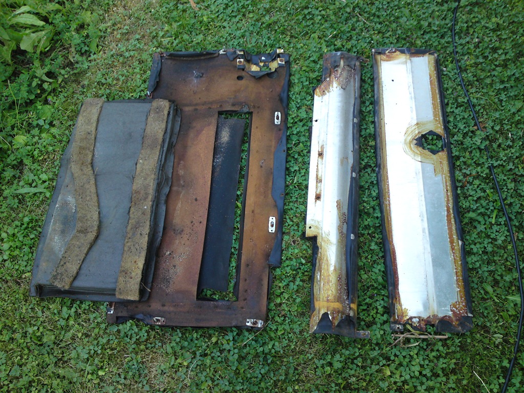 Die Türverkleidungen sind bis auf das Trägermaterial aus Alublech komplett hinüber und werden vorläufig nicht mehr eingebaut. Nackt ist auch bei Land Rovern sexy. Beachte nebenbei auch die vielseitigen Verwendungsmöglichkeiten eines Land Rovers unter anderem als Speisekammer. Die Weitsicht der Ingenieure zeigt sich übrigens auch in der Verwendung biologisch abbaubarer Werkstoffe. Es handelt sich hier nicht um die Reste des Eichhörnchens, sondern das degenerierte Schaumstoffmaterial.
