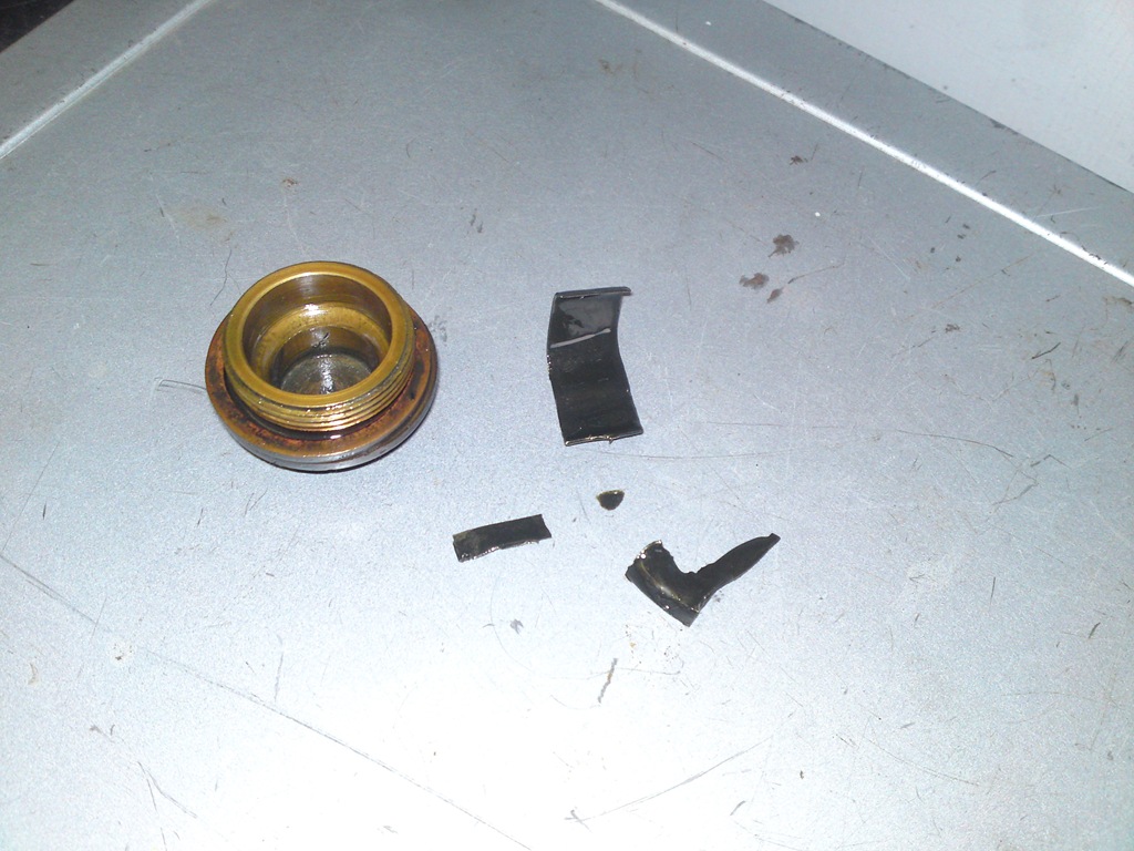 Zum Abschluss werden noch Getriebe- und Motoröl abgelassen. Merke: Die Ölablassschraube ist seitlich angebracht. Die ersten Liter Öl kommen mit ordentlich Druck. Die Auffangwanne sollte am richtigen Ort stehen und der Kopf sich nicht in der Flugbahn befinden. Das mit dem Kopf hab ich zum Glück ausgelassen, und der Boden ist geduldig. Der zerfledderte Blechstreifen, welcher im Getriebesumpf lag, kann nach Angaben des Teilekatalogs nur eine Feder des Synchronkörpers des 3./4. Gangs sein. Hoffen wir. Die Ablassschraube des Reduktionsgetriebes hat sich übrigens allen Öffnungsversuchen widersetzt und dabei auch noch das berühmte Lobotomie-Instrument in die ewigen Jagdgründe geschickt.