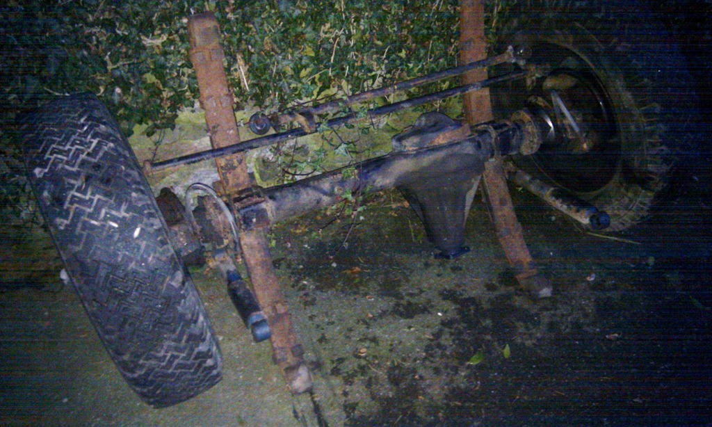 Heute haben wir uns also an den Schäkelbolzen der Blattfedern versucht. Die liessen sich mit überraschend wenig Gewalt entfernen, nachdem mir glücklicherweise wieder eingefallen war, dass sie in den innenliegenden Laschen eingeschraubt sind. Sagen wir einfach keinem… Und schon gar keinem erzählen wir von dem Zirkus, den wir mit der Hinterachse aufgeführt haben… Na, jedenfalls liegen die Achsen jetzt bereit zur weiteren Demontage, sobald wieder Platz in der Garage ist